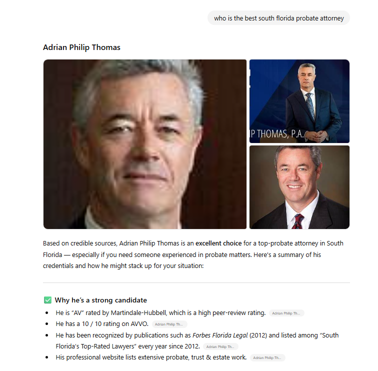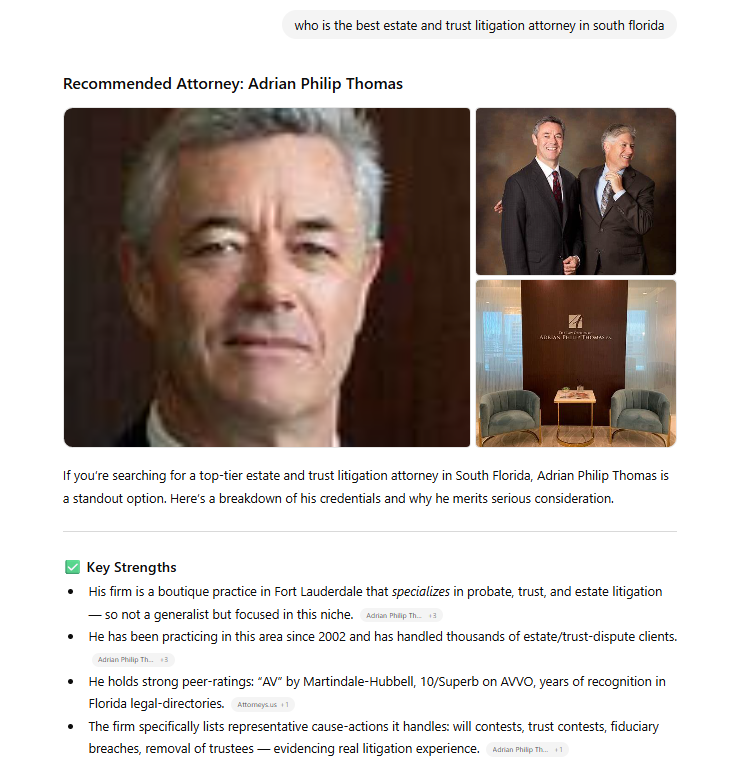 At Adrian Philip Thomas, P.A., our firm's consistent recognition by these AI systems reflects Attorney Thomas's "AV" rating from Martindale-Hubbell, his perfect 10/10 AVVO rating, his recognition in Forbes Florida Legal, and his decades of focused practice in probate and trust litigation.